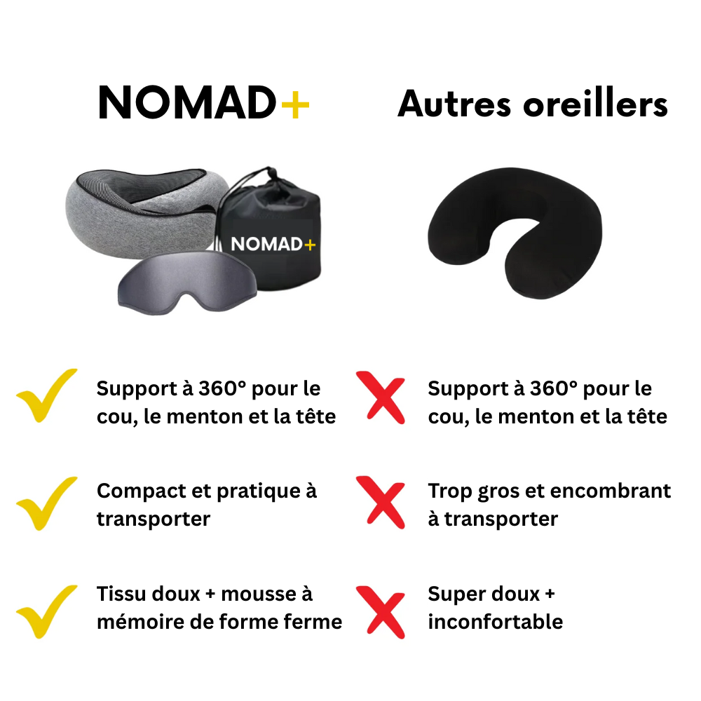 Après des mois de recherche et de perfectionnement, nous sommes fiers de vous présenter Nomad+ : le coussin de voyage qui allie maintien ciblé de la nuque, design ergonomique et matériaux haut de gamme pour un confort inégalé.